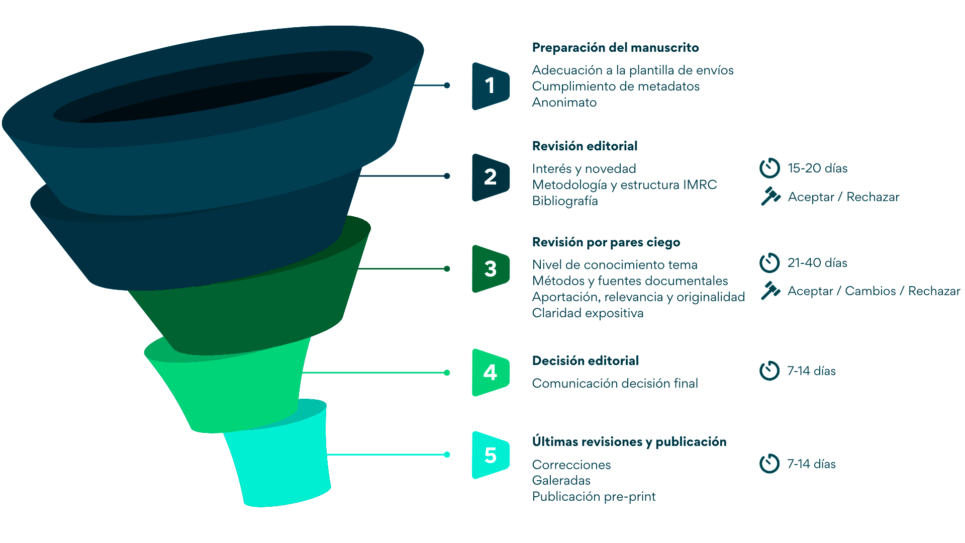 Tras recibir los informes de los revisores, el equipo comunica la Decisión editorial final en un plazo de 7 a 14 días. Esta resolución es el paso previo a la fase de producción, donde se informa oficialmente al autor sobre el estatus de su publicación.