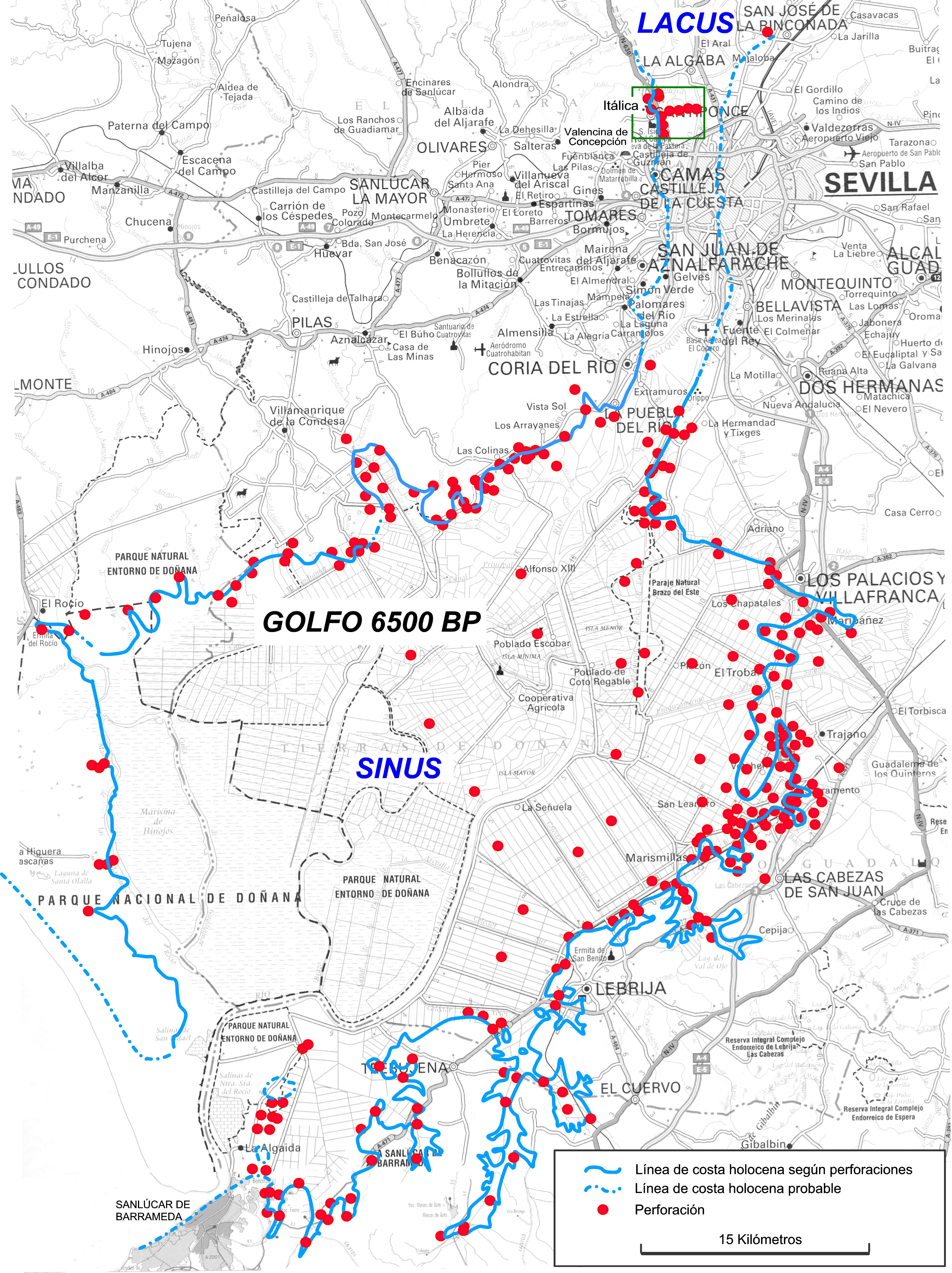 Mediante la aplicación de nuevos métodos y técnicas de observación se presentan los resultados de una investigación interdisciplinar que permite delimitar la línea de costa del paleoestuario del río Guadalquivir (hace unos 6500 años). Entre otras primicias científicas se constata la existencia de un lacus por delante del frente de Santiponce, que conectaba con el mar abierto a través de una amplia y profunda ría. Este paisaje paleoestuarino contaba en la orilla acantilada del Aljarafe con una potencia de agua suficiente todavía en época romana para arribar a Itálica por navegación, lo que explica la estratégica ubicación de la ensenada portuaria ocupada por P. Cornelius Scipio Africanus maior después de la batalla de Ilipa (206 a.C.).