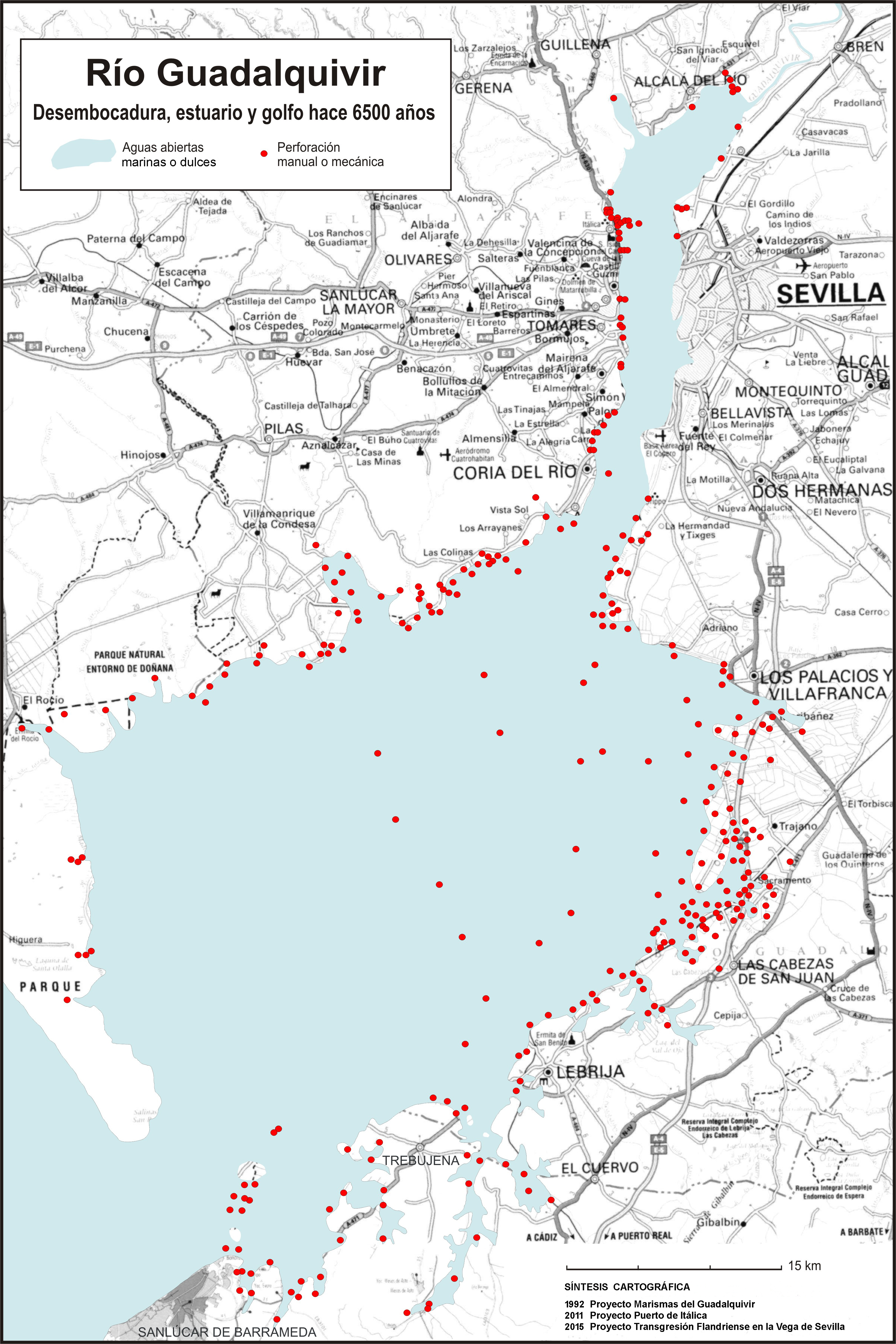 Se presenta la primicia cartográfica de un mapa costero del golfo, estuario y desembocadura del río Guadalquivir hacia el óptimo climático de la Transgresión Flandriense (c 6500 BP). Para su elaboración los autores han desarrollado en una colaboración interdisciplinar de más de veinte años el método y técnicas de observación adecuadas para la consecución de los datos necesarios. Se ofrece el mapa del río Guadalquivir referente a los tiempos de la transición histórica entre el Neolítico y Calcolítico como una contribución al avance del conocimiento de la prehistoria en el ámbito atlántico-mediterráneo de la Península Ibérica.